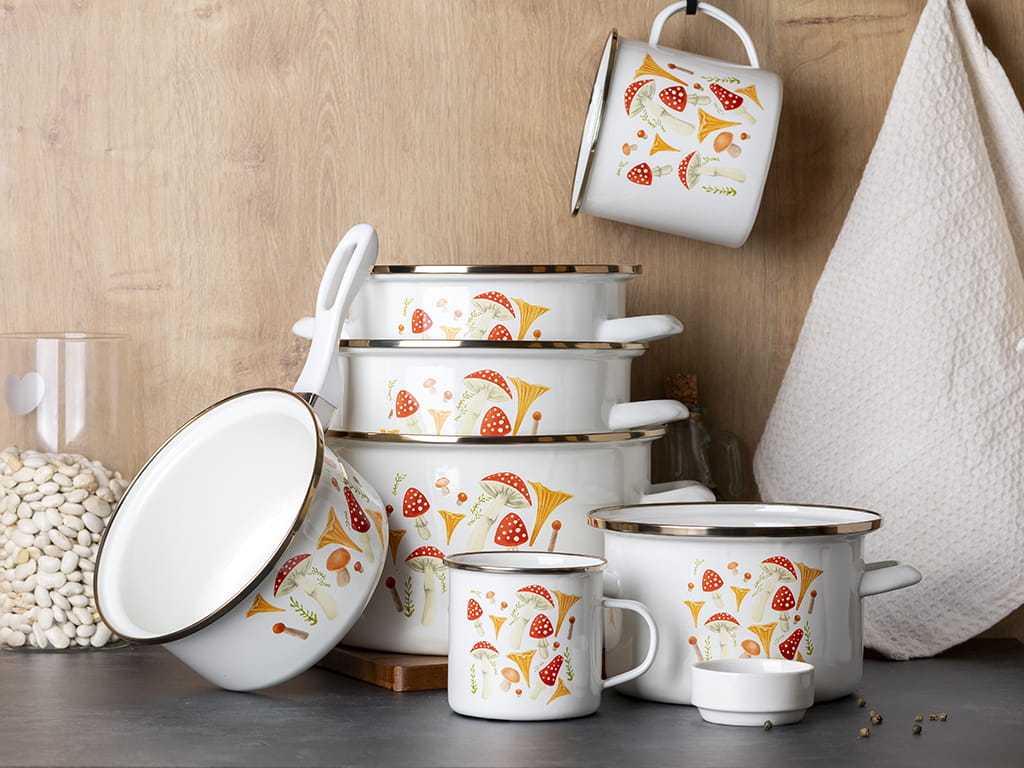 Garnek Emaliowany Biały Grzyby Złote Okucie Emalia Pleszew 22 Cm 4,8 L