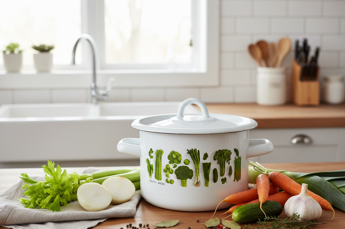 Garnek Emaliowany Z Pokrywką Net-Pol Biały Warzywa Zielone 20 Cm 4,5 L