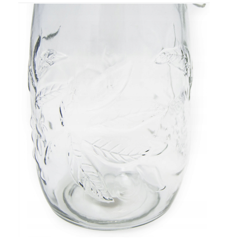 Słoik posiada wybrzuszenia w kształcie owoców, które dodają mu atrakcyjności