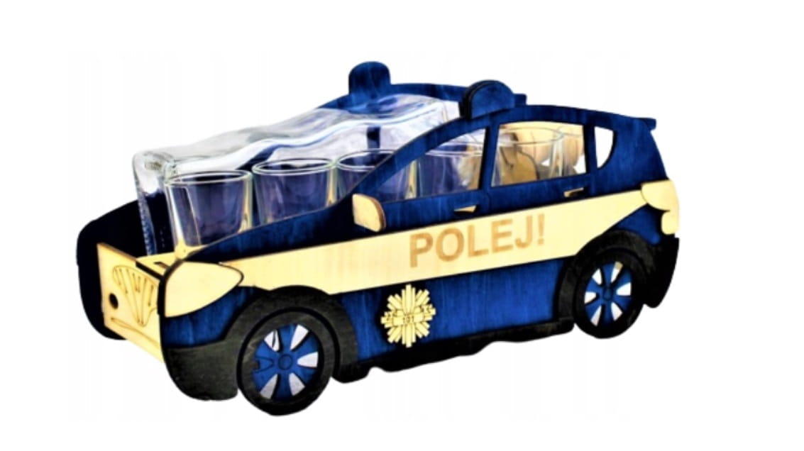 - drewniana kolorowa podstawa wycinana laserowo w kształcie radiowozu z napisem ” POLEJ „ x 1 szt